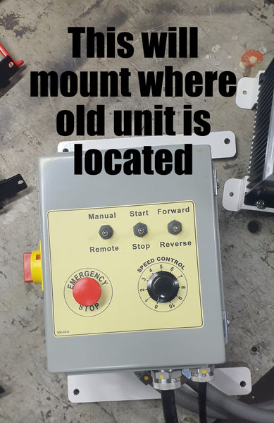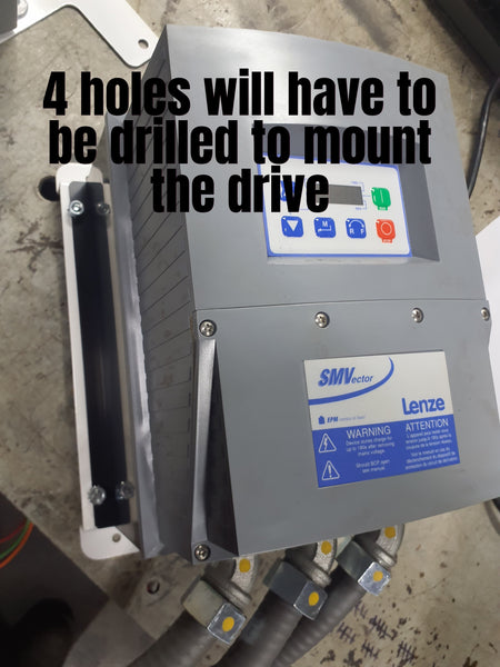 The control box will mount on the 4 studs where current control box and drive is mounted. The drive will be mounted to the top right of motor. Four holes will need to be drilled in console to mount the drive.